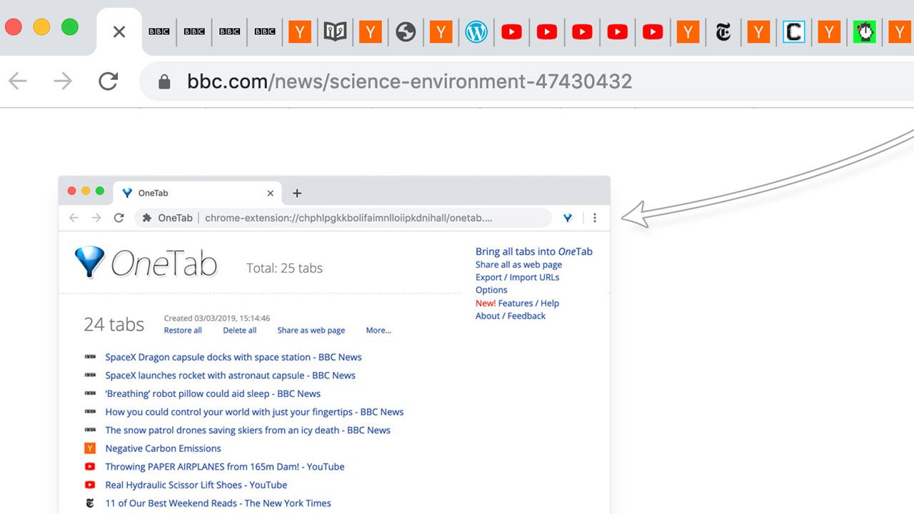 Kemudian ada OneTab yang menjadi browser extension pilihan berikutnya untuk mengatasi banyaknya tab yang dibuka. Di mana, membuka banyak tab browser jelas menghabiskan banyak memori yang bisa membuat kinerja komputer menjadi lambat. Dengan menggunakan OneTab, kamu bisa mengubah semua tab menjadi daftar.