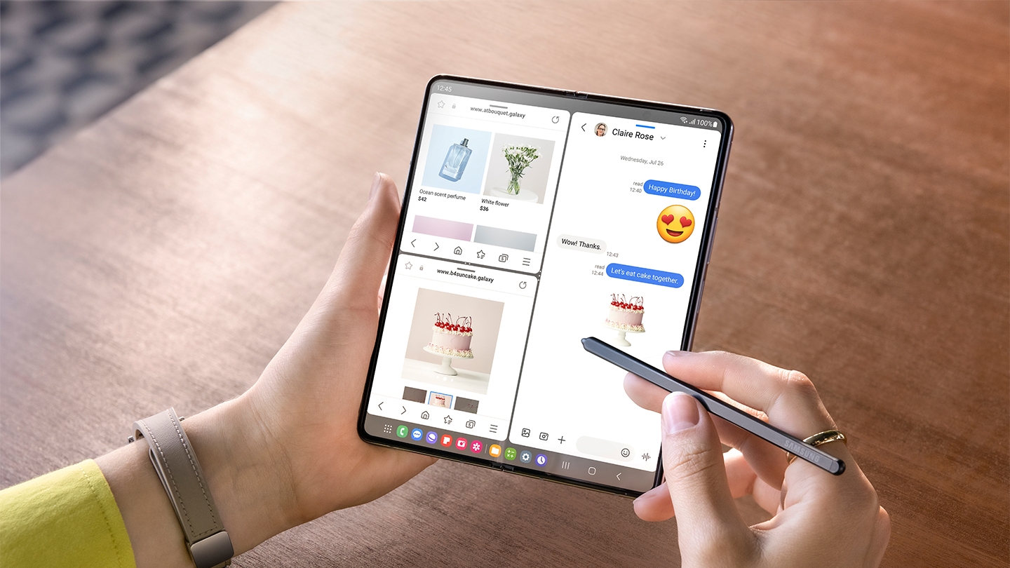 Tidak heran kalau fitur Multi Window menjadi salah satu fitur Galaxy Z Fold 5 yang paling diunggulkan untuk mendukung kemudahan aktivitas remote working. Kamu bisa menjalankan lebih dari satu jendela aplikasi sekaligus dan menyederhanakan proses pekerjaanmu menjadi lebih singkat. Fitur Galaxy Z Fold 5 ini sangat memanjakan bagi kamu yang harus membuka rapat melalui video conference, tetapi masih harus mengejar deadline pekerjaan lainnya.