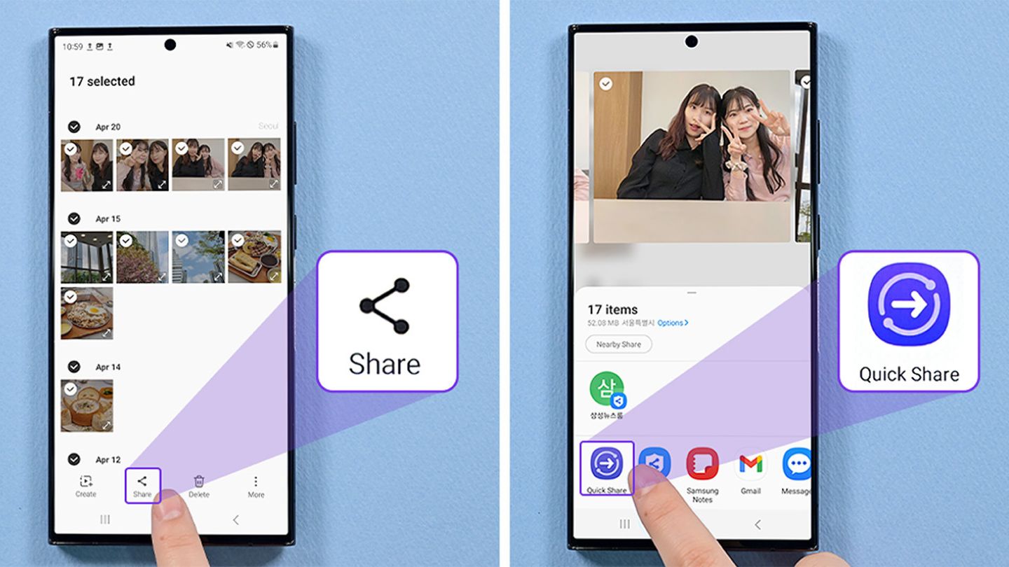 Menangkap berbagai momen saat menghabiskan waktu bersama teman dan keluarga merupakan hal yang zaman sekarang patut kamu lakukan, apalagi jika kamu baru bertemu mereka setelah sekian lama. Setelahnya, mungkin kamu akan menemukan galerimu menjadi penuh dengan foto dan video dari momen kebersamaan itu. Untuk menghindari proses yang memakan waktu panjang untuk membagikannya, gunakanlah Samsung Quick Share.