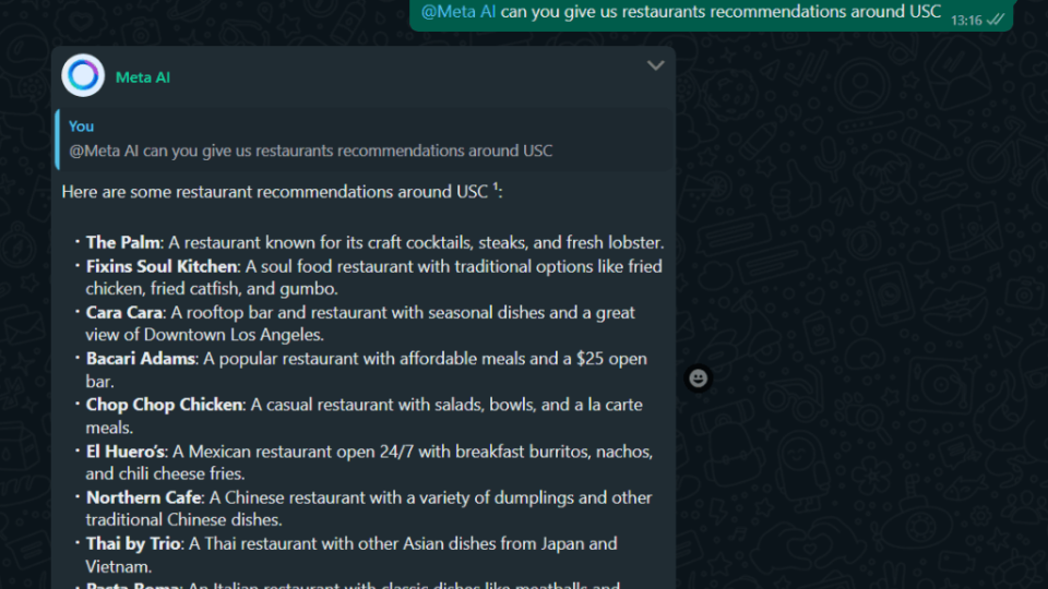 Meta AI di WhatsApp mampu memberikan rekomendasi hiburan seperti film, serial TV, atau musik berdasarkan preferensi. Fitur pintar ini juga bisa memberikan banyak rekomendasi lainnya seperti restoran terbaik, tempat wisata, dan segala kebutuhan kamu. Cukup ketik informasi seputar rekomendasi apa yang kamu mau dan Meta AI Whatsapp akan memberikan saran yang relevan dengan tautan untuk mengaksesnya.