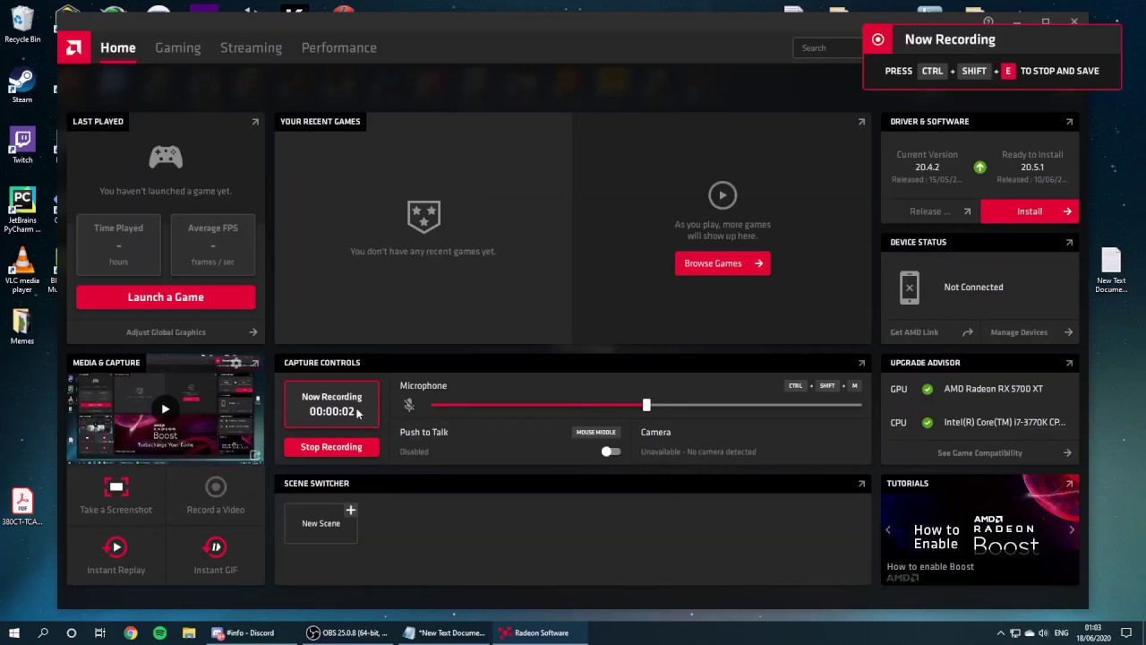 Software rekam layar selanjutnya yang direkomendasikan adalah Gamecaster. Software ini memiliki tampilan yang cukup sederhana, di mana software akan menawarkan pilihan streaming maupun perekaman saat pertama menggunakannya. Kedua pilihan tersebut tentunya sudah dikonfigurasi menggunakan kualitas video gameplay yang diatur secara otomatis dengan GPU sebagai encoder default.