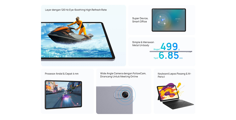 Pasangkan HUAWEI MatePad Anda dengan stylus HUAWEI M-Pencil (generasi ke-2), yang menangkap nuansa penuh dari setiap garis, titik, dan sapuan kuas, berkat sensor tekanan tingkat 4,096. HUAWEI Smart Keyboard juga sangat fleksibel karena dapat dipasang atau dilepas ke tablet untuk penggunaan dalam berbagai skenario.