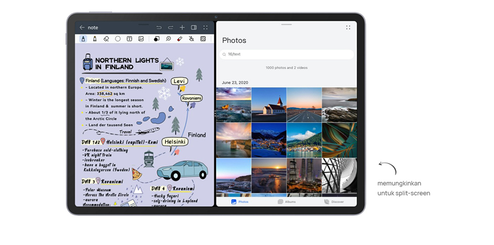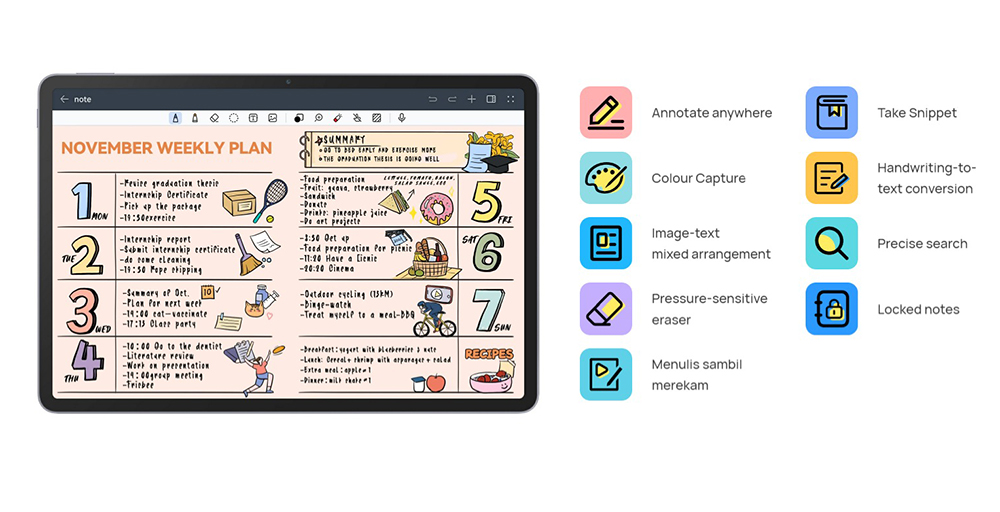 HUAWEI Notes kini hadir dengan lebih banyak fitur baru. Akses catatan Anda dengan cepat melalui Quick Notes. Highlight bagian penting saat presentasi dengan fitur highlighter, dan rekam perbincangan saat rapat sebagai catatan secara real time. Berkat fitur split-screen, pengoreksian dan revisi bisa lebih mudah dari sebelumnya. Perbesar kanvas sebanyak 15 kali untuk menggambar peta pikiran Anda dengan sangat detail.
